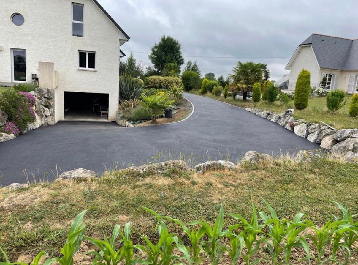 Terrassement, préparation du sol et application d'enrobé pour allées, cours et parkings.
