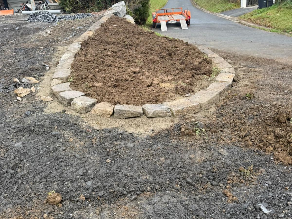 Terrassement, préparation du sol et application d'enrobé pour allées, cours et parkings.